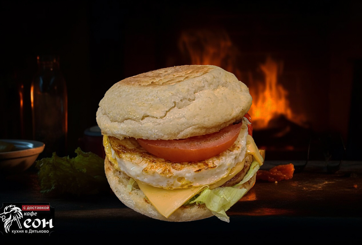 Булочка Маффин.соус чесночный.айсберг.котлета свиная.сыр чеддер.меланж яичный.помидор.